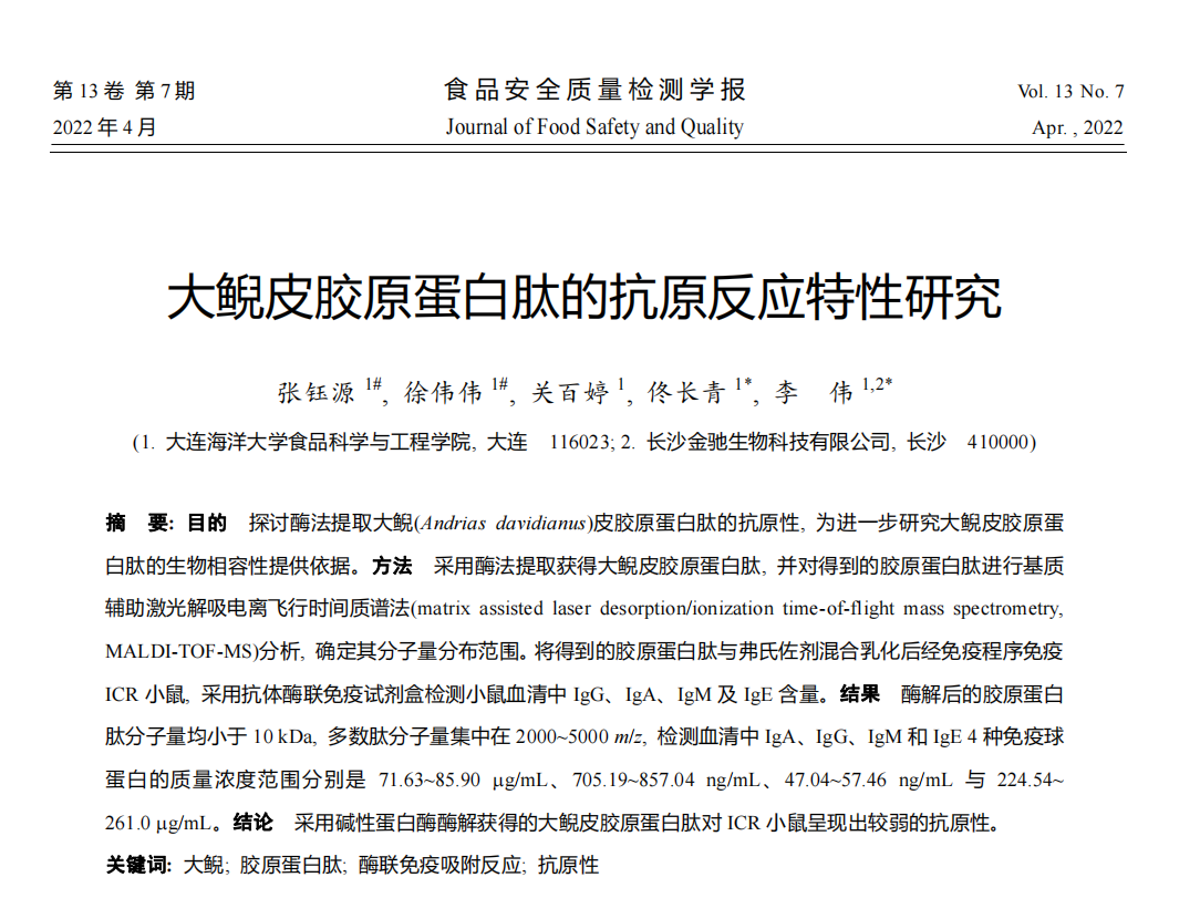 相關(guān)研究成果以“大鯢皮膠原蛋白肽的抗原反應特性研究”為題,發(fā)表在《食品安全質(zhì)量檢測學報》上。該工作第一作者是李偉教授團隊的碩士研究生張鈺源和徐偉偉。