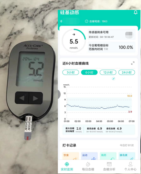 重點來了,動態(tài)血糖儀可以實時監(jiān)測血糖變化情況。這款硅基動感把每間隔5分鐘生成的血糖數(shù)據(jù)上傳到手機APP上,血糖分析和數(shù)據(jù)顯示都非常直觀,讓使用者能夠一目了然的觀察到每個時間段自身血糖的波動情況。