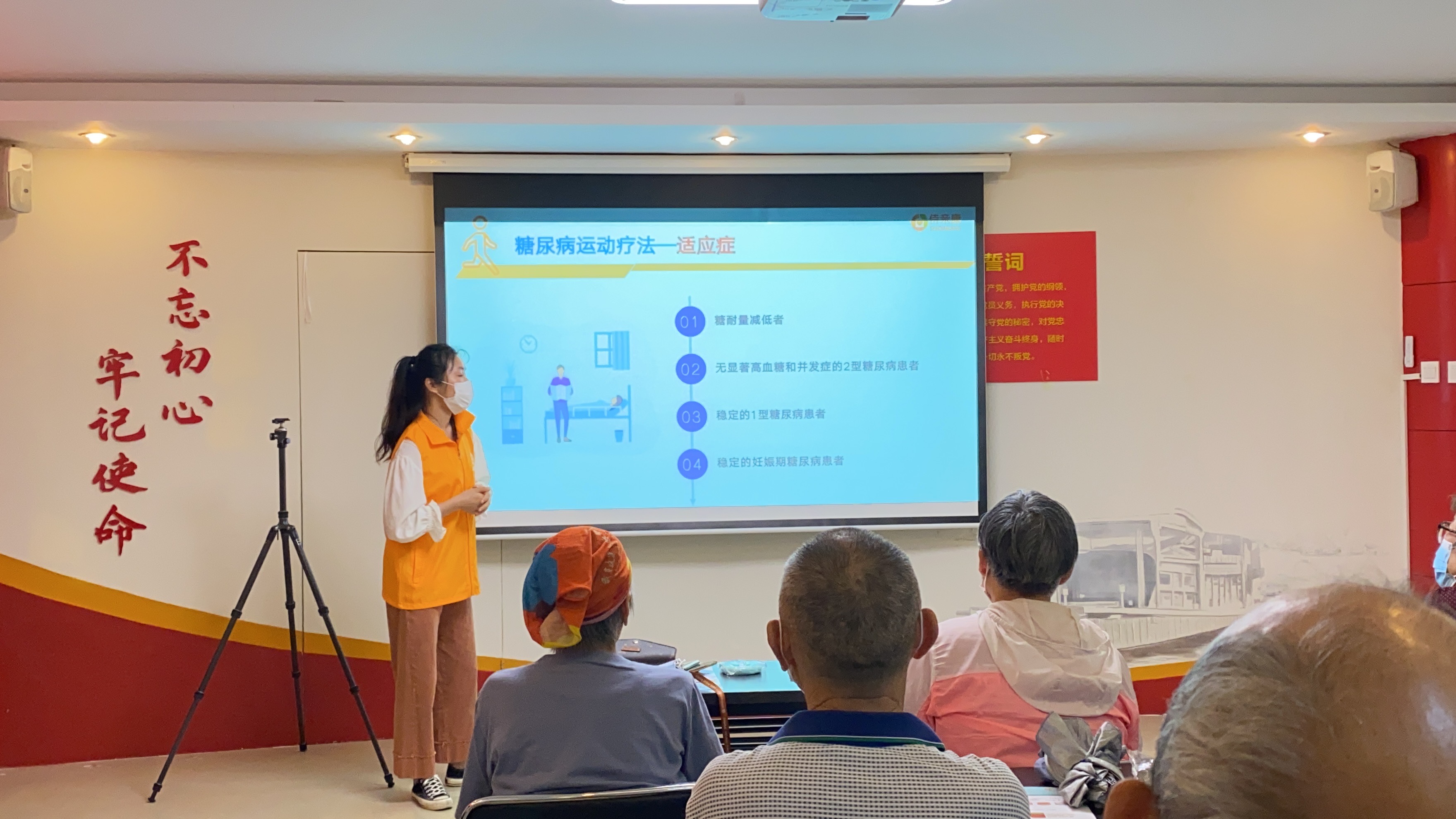 活動開始由康寶養(yǎng)老助老微基金健康管理師柏兒圍繞“糖尿病的運動療法”進行了精彩分享,分別從中心性肥胖、運動方式、運動強度、注意事項等方面進行了深入淺出的講解,闡述了運動治療與糖尿病的關(guān)系,并通過現(xiàn)場教學(xué)的方式讓慢病居民用戶通俗易懂地了解運動治療對于糖尿病的重要性。