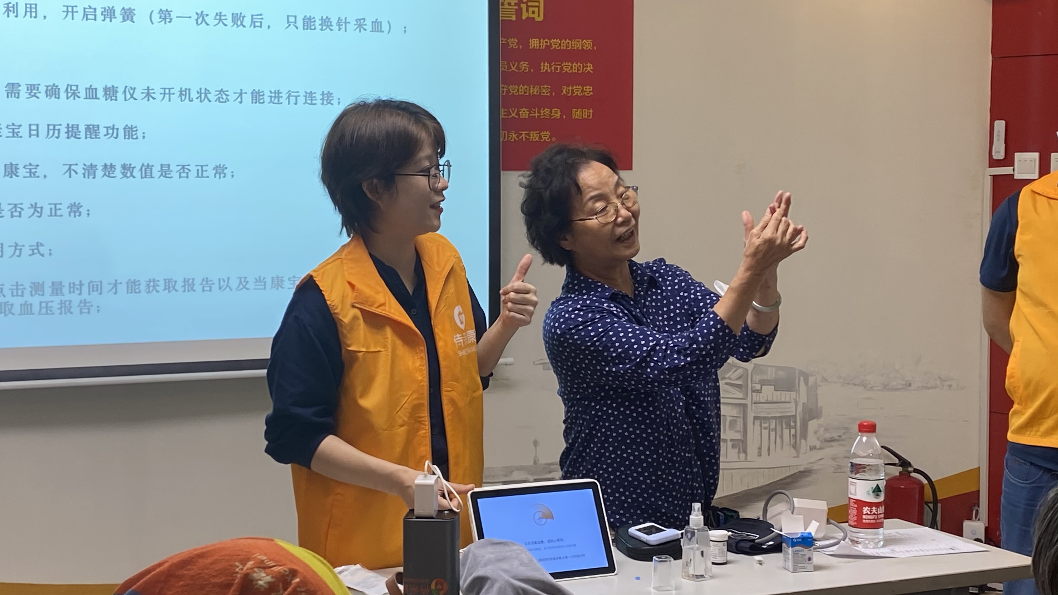 詳細回答了每一個用戶使用過程中遇到的問題,并通過現(xiàn)場演練加深健康監(jiān)測實操,確保通過1V3的教學(xué)讓每一位慢病居民用戶都能夠順暢通過康寶居家智能健康管理設(shè)備進行健康監(jiān)測管理。