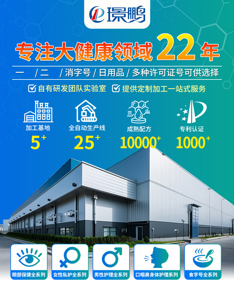 璟鵬生物為您提供完整的OEM貼牌加工服務(wù),產(chǎn)品策劃(劑型、配方、工藝制定)、商標(biāo)注冊、包裝設(shè)計(jì)、產(chǎn)品注冊備案審批、下單生產(chǎn)、檢驗(yàn)出廠、全程無憂一件代發(fā)。