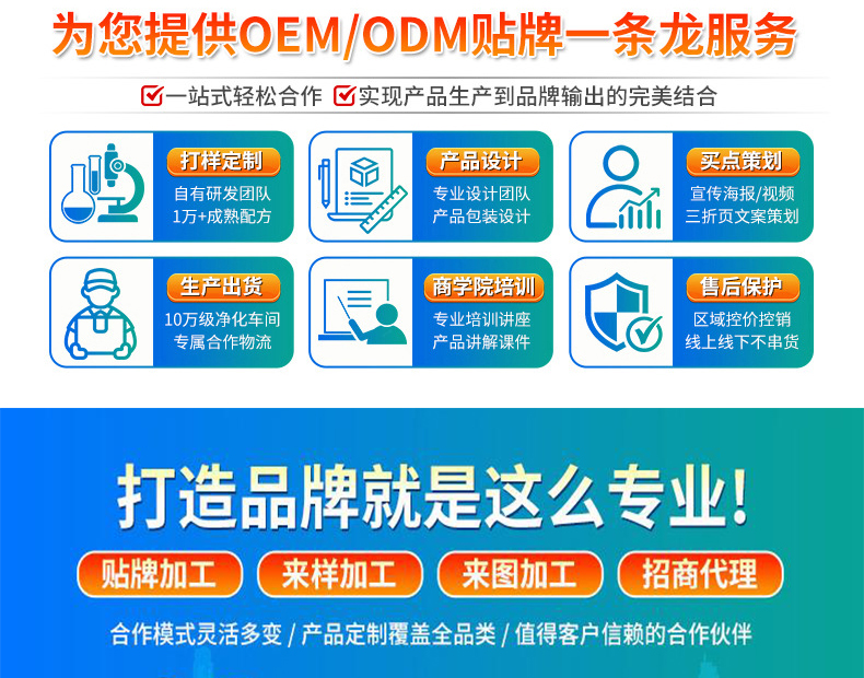 璟鵬生物為您提供完整的OEM貼牌加工服務(wù),產(chǎn)品策劃(劑型、配方、工藝制定)、商標(biāo)注冊(cè)、包裝設(shè)計(jì)、產(chǎn)品注冊(cè)備案審批、下單生產(chǎn)、檢驗(yàn)出廠、全程無(wú)憂一件代發(fā)。